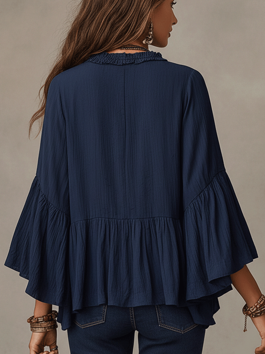 Los volantes aportan movimiento y feminidad, mientras que el diseño bohemio y fluido da forma a una blusa ligera y cómoda, perfecta para looks relajados con un toque sofisticado.