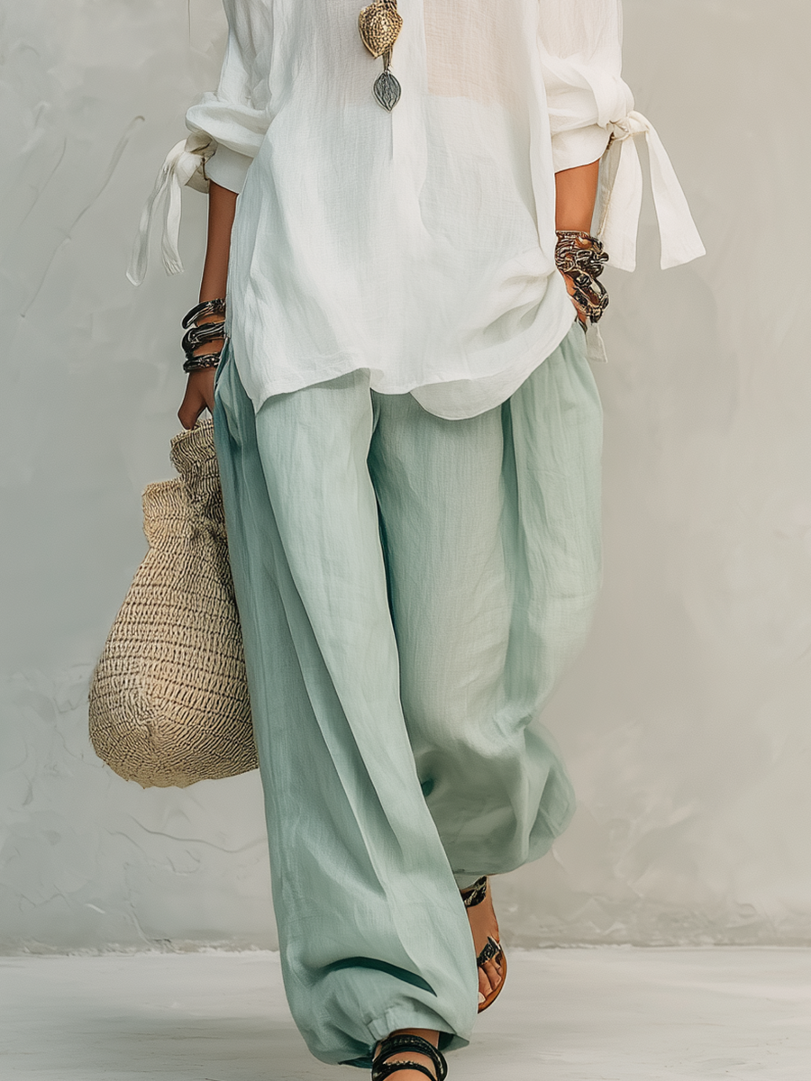 CONJUNTO BOHO CON CAMISA BLANCA Y PANTALÓN VERDE SALVIA