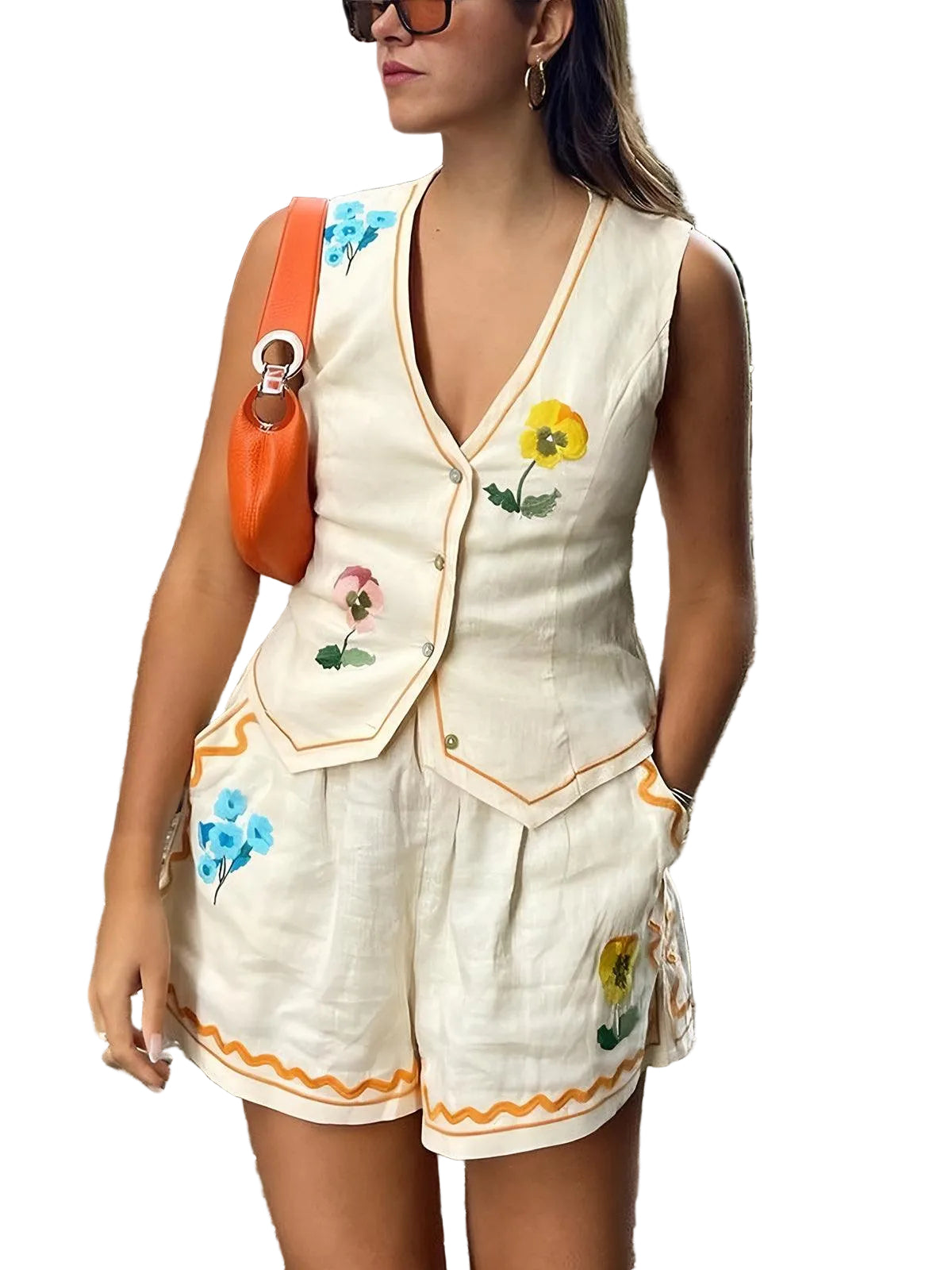 Este conjunto de shorts con estampado floral se combina con un top de tirantes ligero, creando un look equilibrado y cómodo. Su diseño desenfadado y su estética veraniega lo convierten en una opción ideal para vacaciones, paseos o looks casuales con un toque elegante.