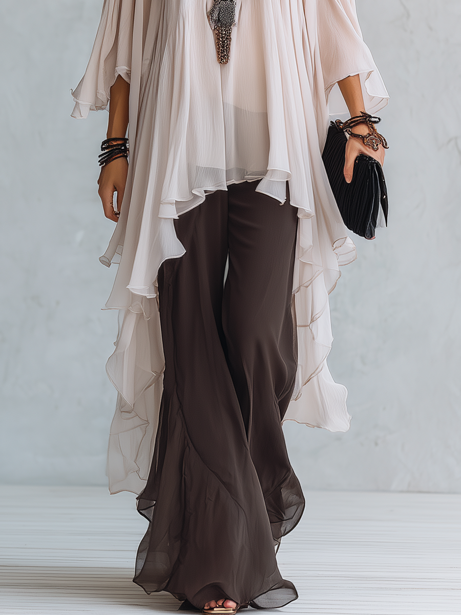 Off-white Layered Chiffon Top Paired With Brown Flared Trousers.