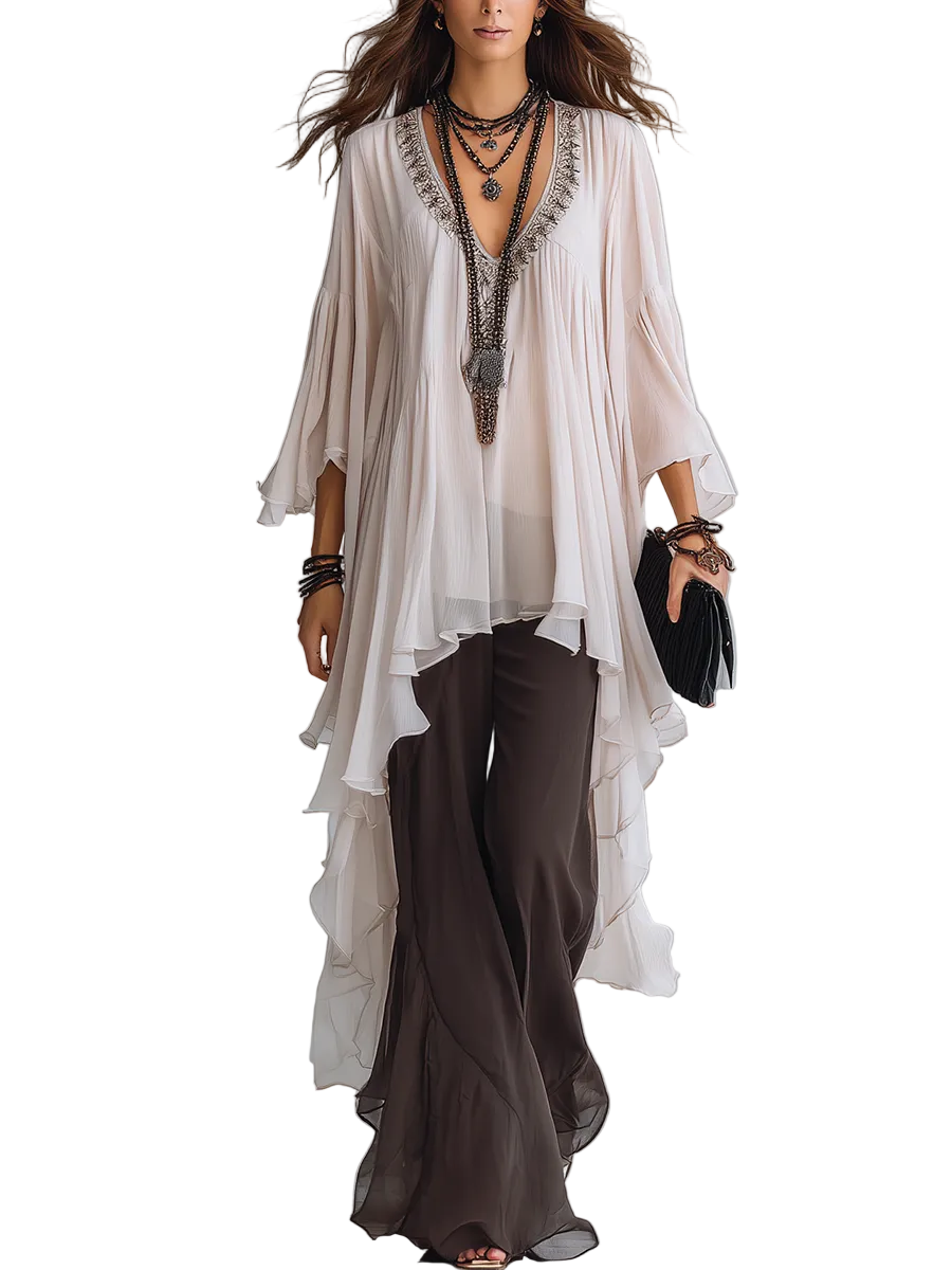 Este conjunto presenta un top de gasa en capas en tono blanco roto, que aporta delicadeza y fluidez, combinado con un pantalón acampanado marrón que estiliza la silueta. El contraste de texturas y volúmenes crea un look sofisticado y femenino, ideal para ocasiones especiales o estilismos cuidados con un aire actual.