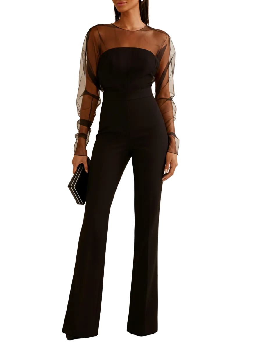 Este mono elegante de manga larga destaca por su cuello redondo de malla negra, que aporta un toque sutilmente sensual y refinado. Su silueta estilizada y su acabado cuidado lo convierten en una opción ideal para eventos especiales o looks nocturnos con una estética elegante y moderna.