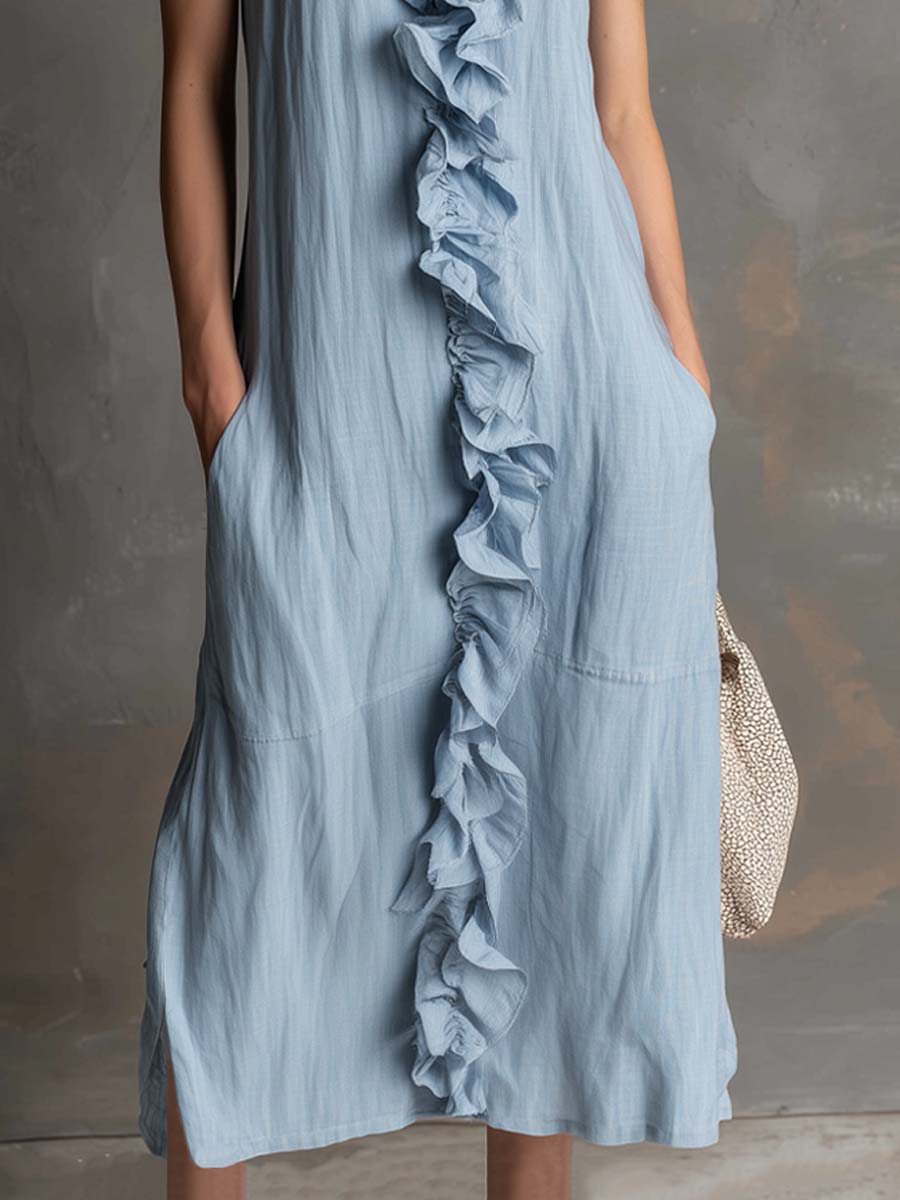 Relaxed Fit Side Pockets Ruffled Placket Cotton-linen Midi Dress