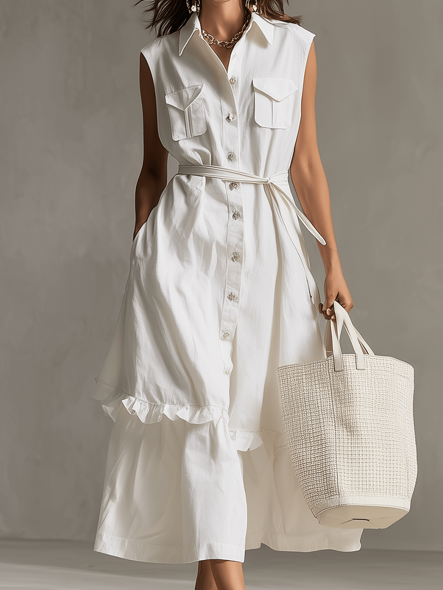 Formato: Vestido midi camisero en blanco con cinturón ajustable.