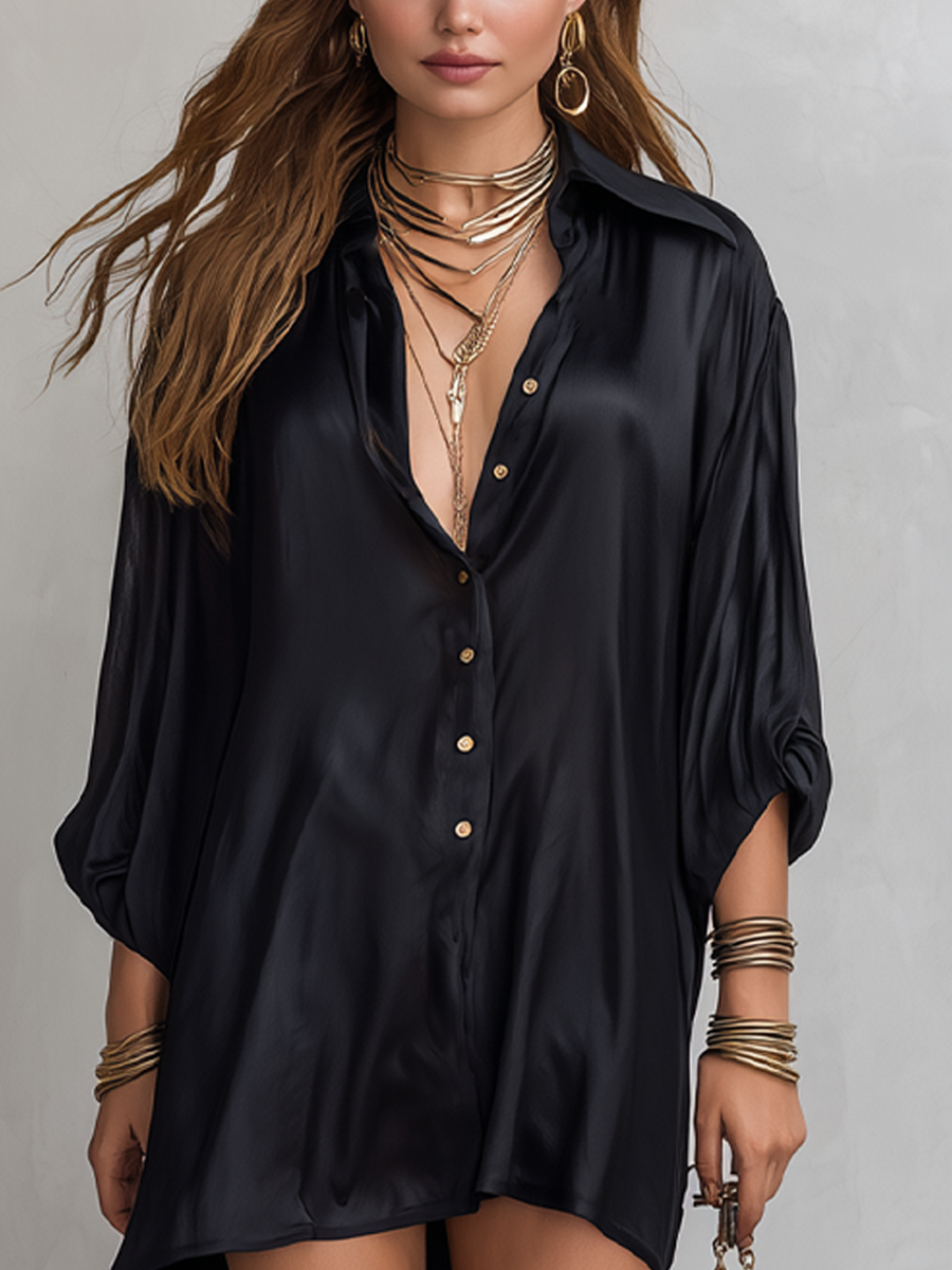 Black Satin Shirt-style Mini Dress