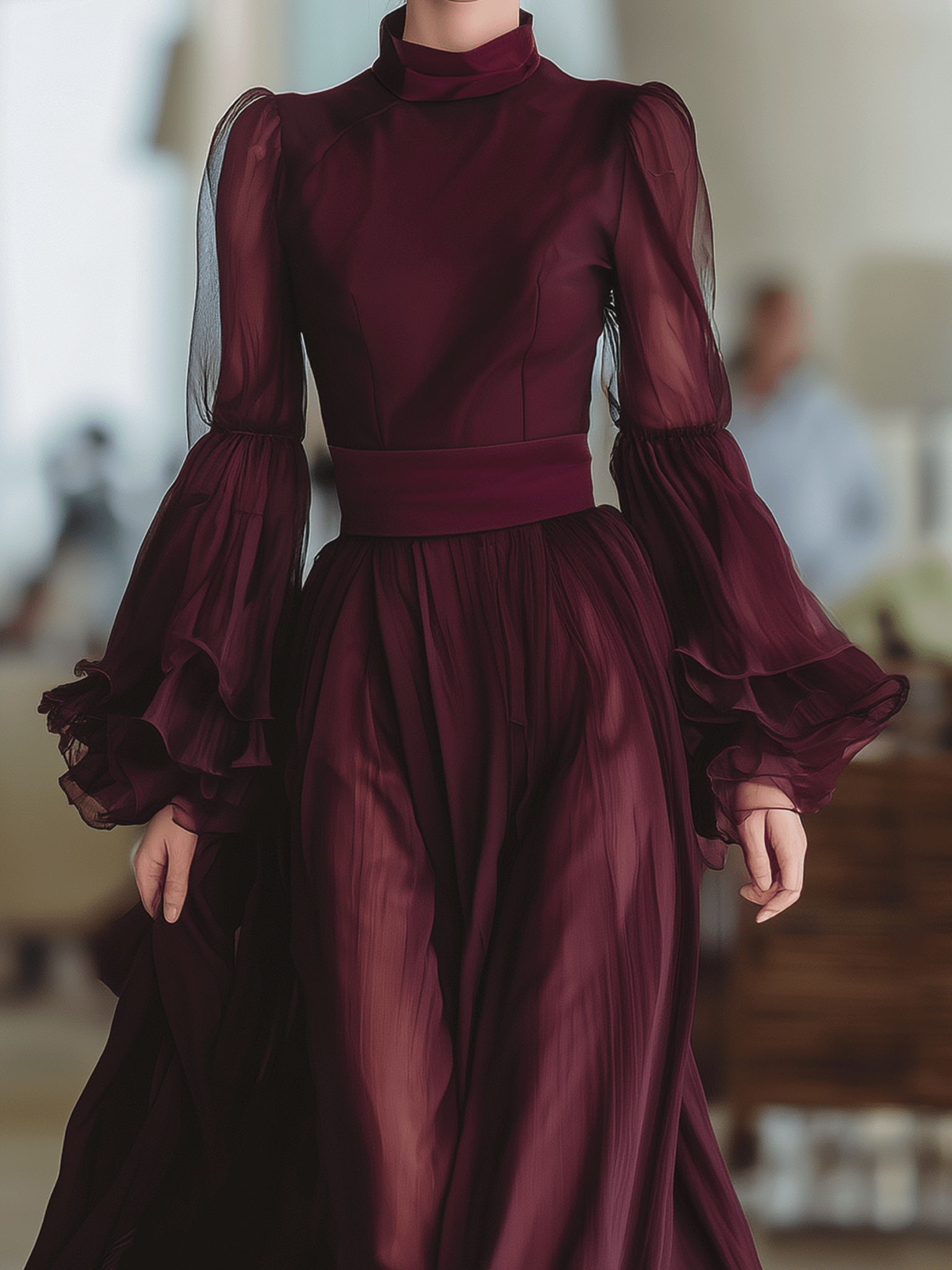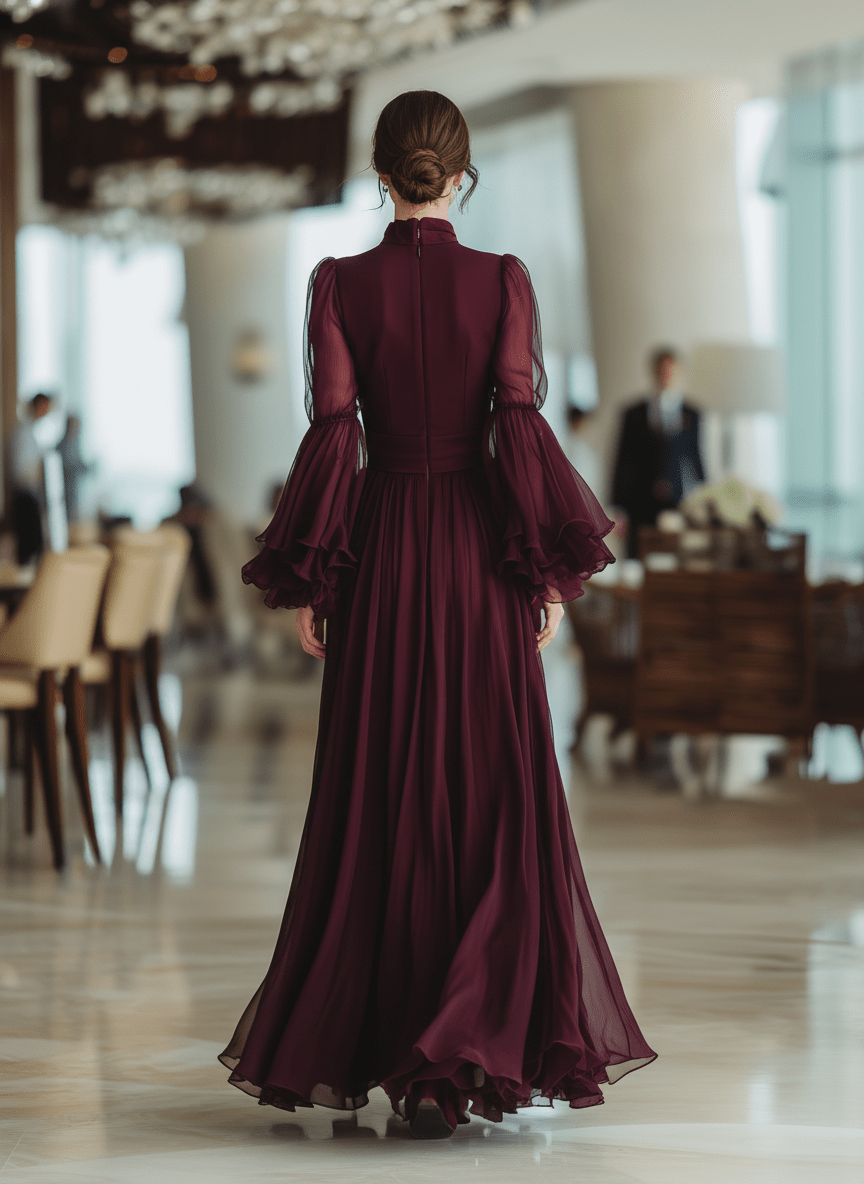 El cuello alto estiliza la parte superior y equilibra el diseño, mientras que las mangas largas con volantes añaden fluidez y carácter. Su silueta en línea A acompaña el movimiento con naturalidad, convirtiéndolo en una pieza ideal para ocasiones especiales.