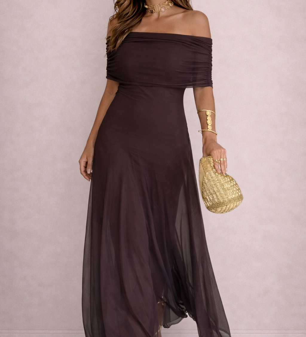 VESTIDO MAXI MARRÓN DE MALLA DE UN HOMBRO