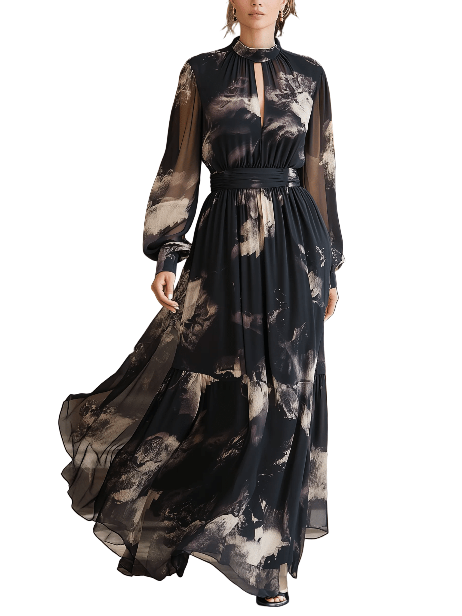 Formato: Vestido largo de gasa con cuello alto y abertura decorativa.