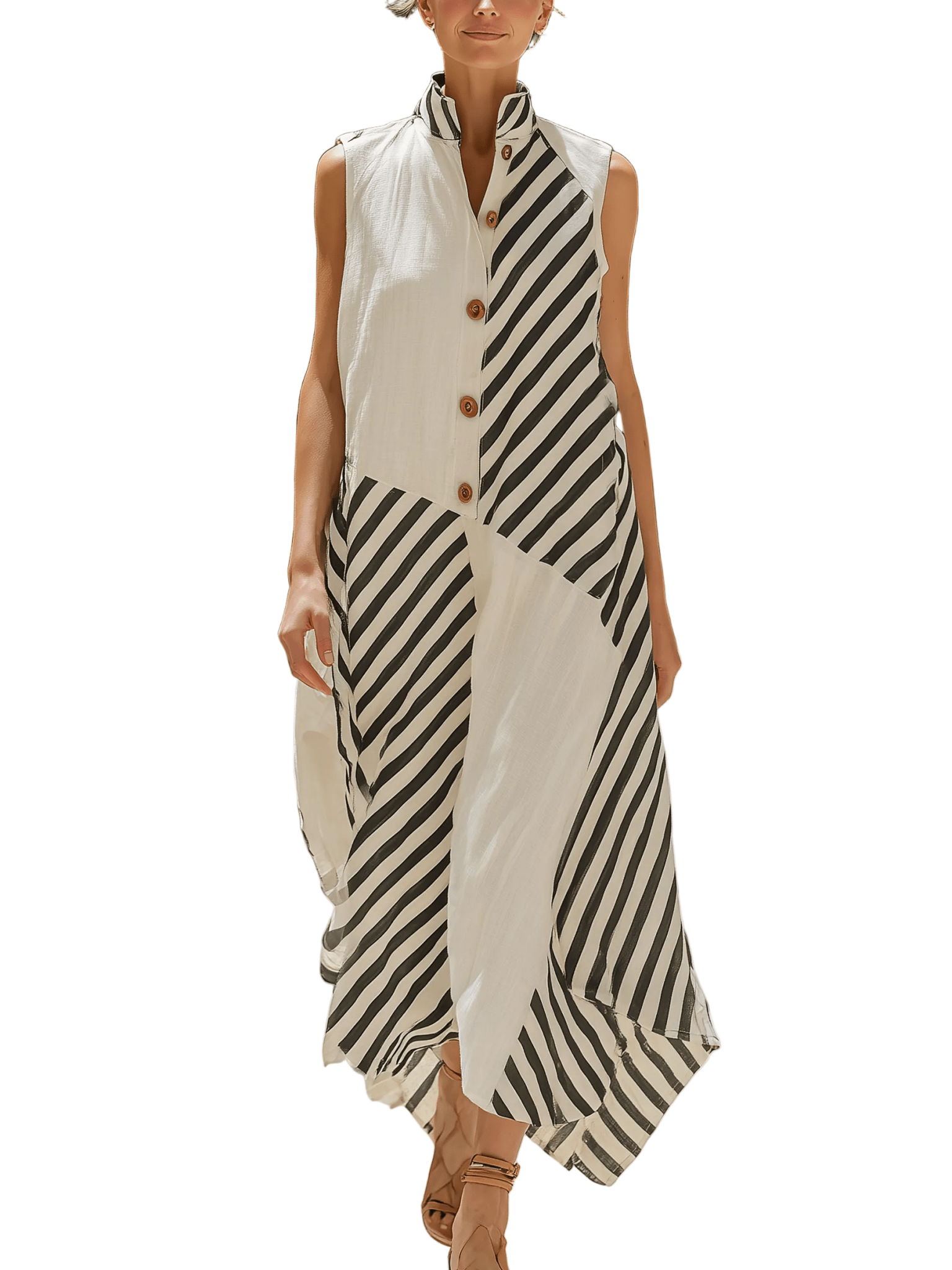 El diseño sin mangas aporta ligereza y libertad de movimiento, mientras que el tejido de mezcla de lino ofrece una sensación agradable y transpirable. Las rayas verticales estilizan la silueta y aportan un toque clásico muy versátil.