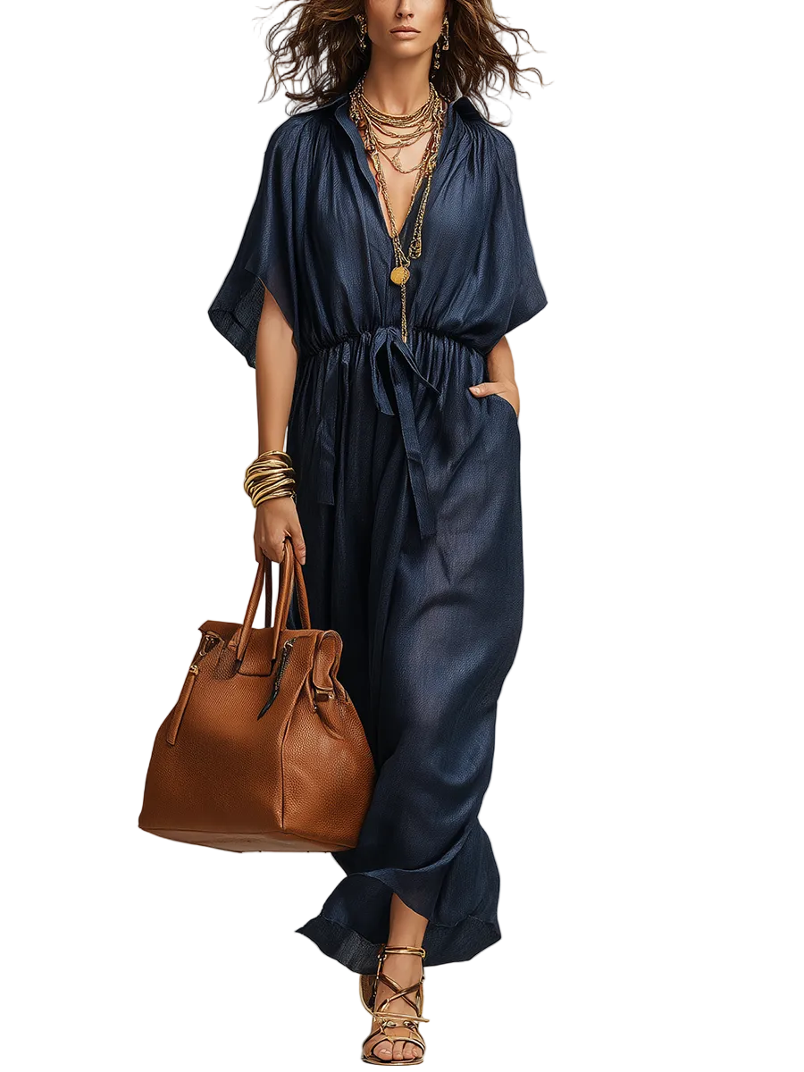 Sophisticated Navy Denim Drawstring Waist Maxi Dress