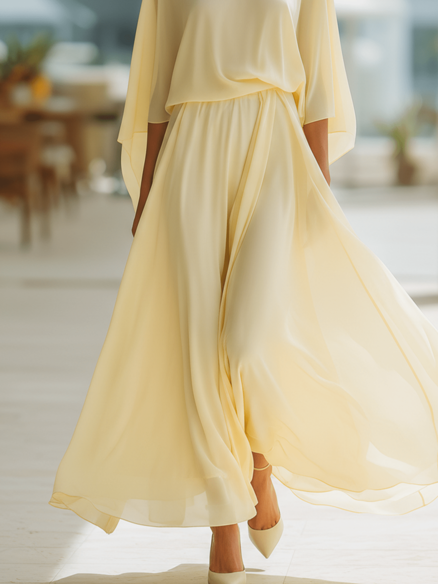 VESTIDO MAXI DE GASA AMARILLO CREMA CON MANGAS CAPA