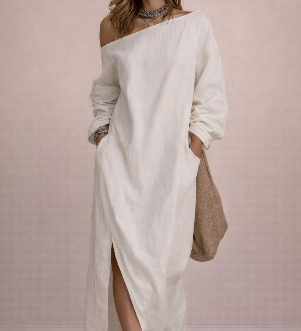 VESTIDO MIDI SUELTO DE ALGODÓN Y LINO CON UN HOMBRO