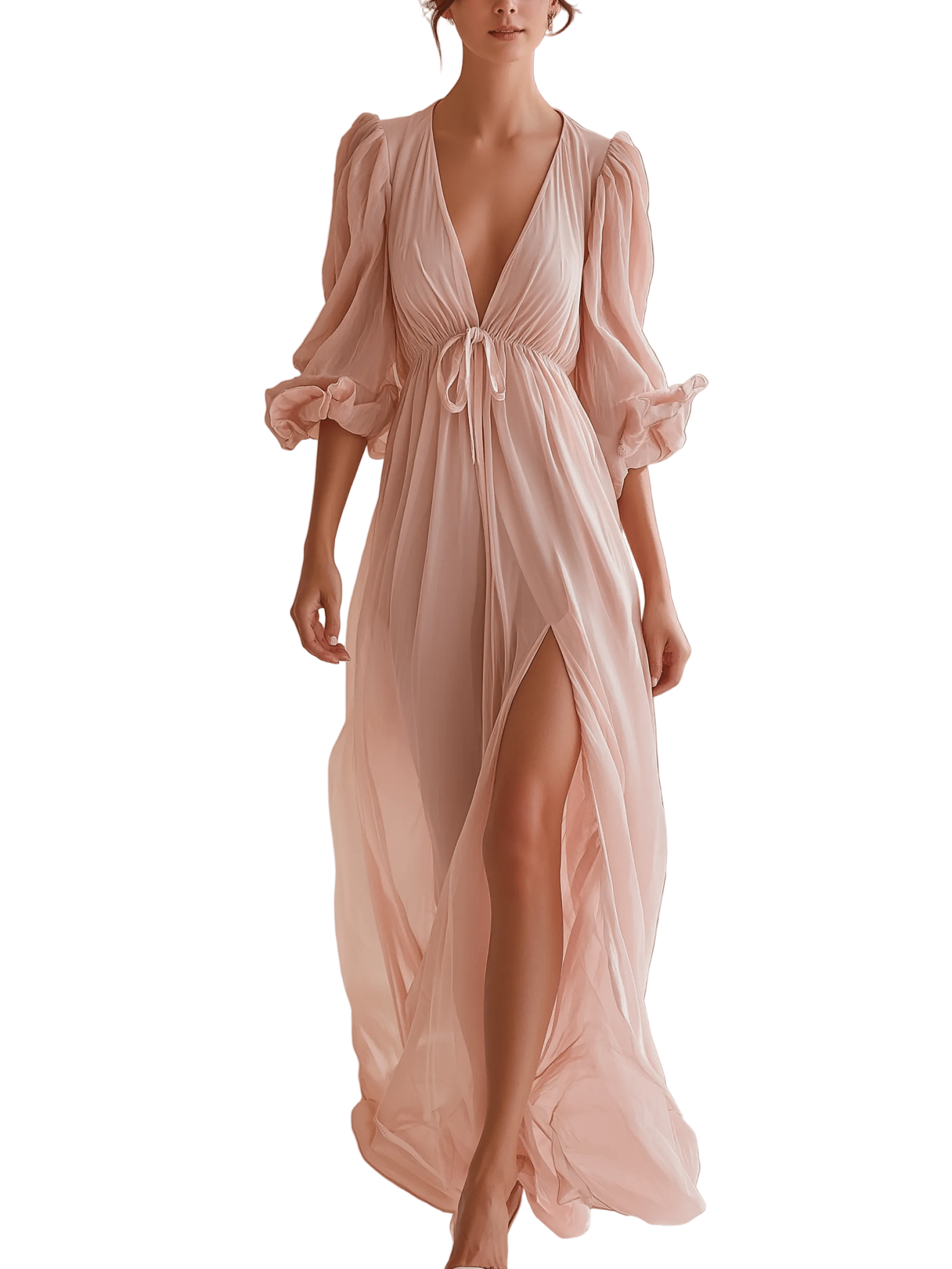 Formato: Vestido largo de gasa con escote en V y mangas abullonadas.
