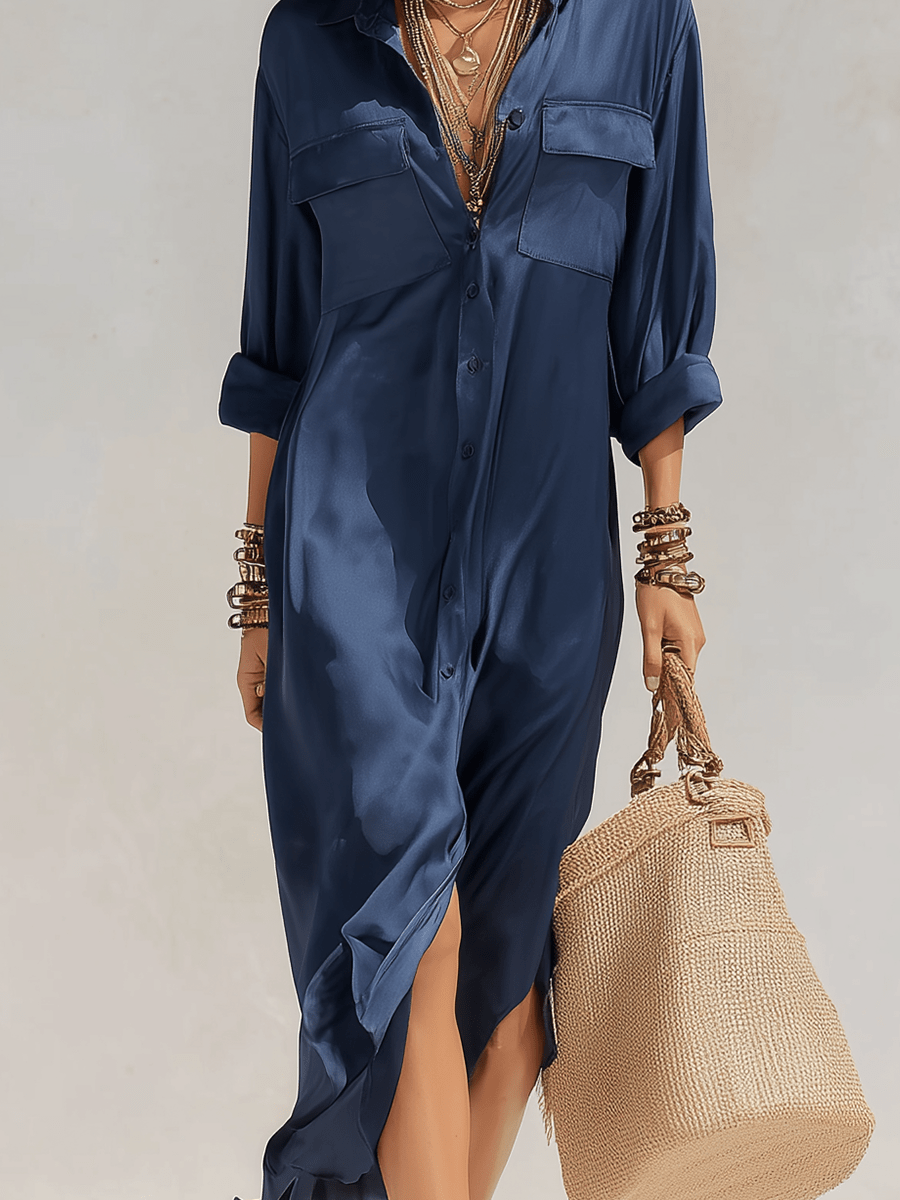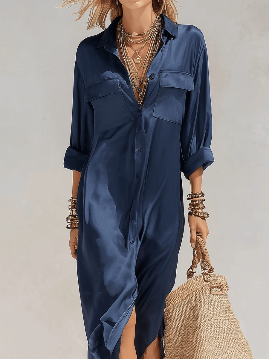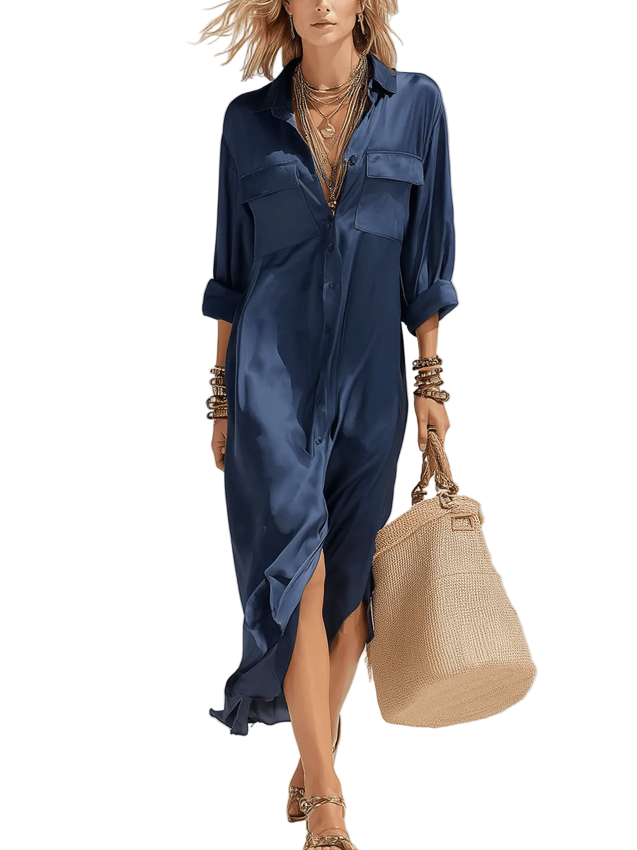 El satén en azul profundo crea un efecto sedoso y luminoso que aporta sofisticación sin necesidad de adornos.