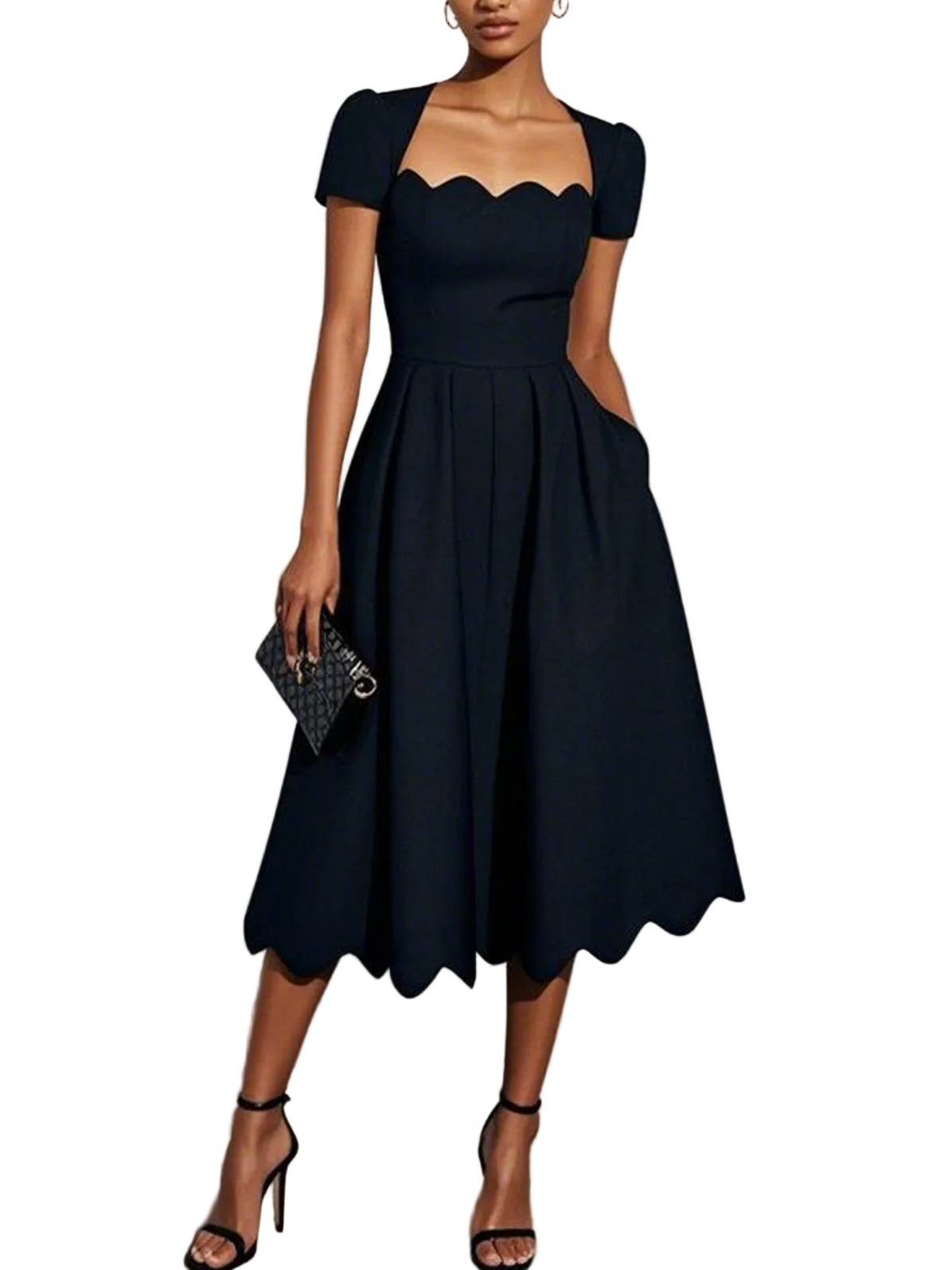 Black Irregular Craftsmanship Classic Square Neck Short Sleeve A-Line Midi Dress